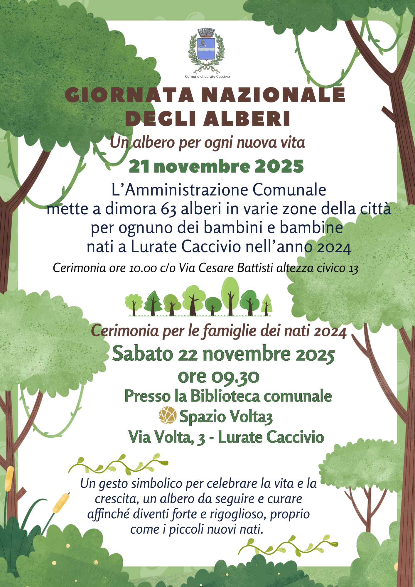 In occasione della Giornata Nazionale degli alberi, il 21 novembre, l'amministrazione comunale mette a dimora 63 alberi in varie zone della città per ognuno dei bambini e bambine nati a Lurate Caccivio nell'anno 2024.