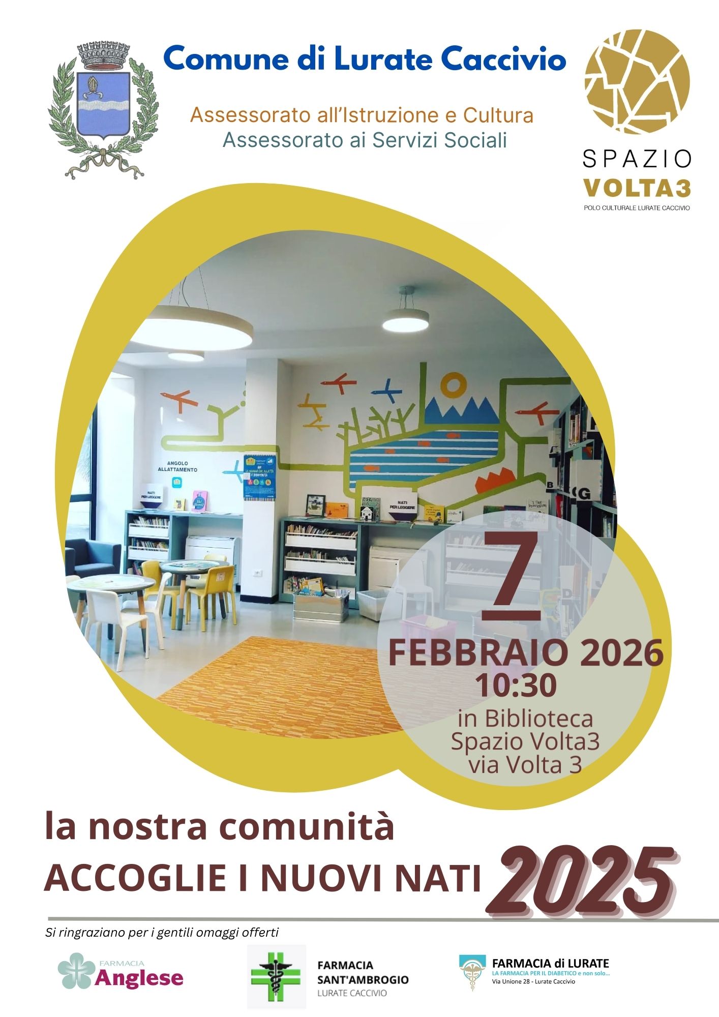 La comunità di Lurate Caccivio accoglie i nuovi nati 2025 sabato 7 febbraio alle ore 10:30 presso la biblioteca Spazio Volta3.
