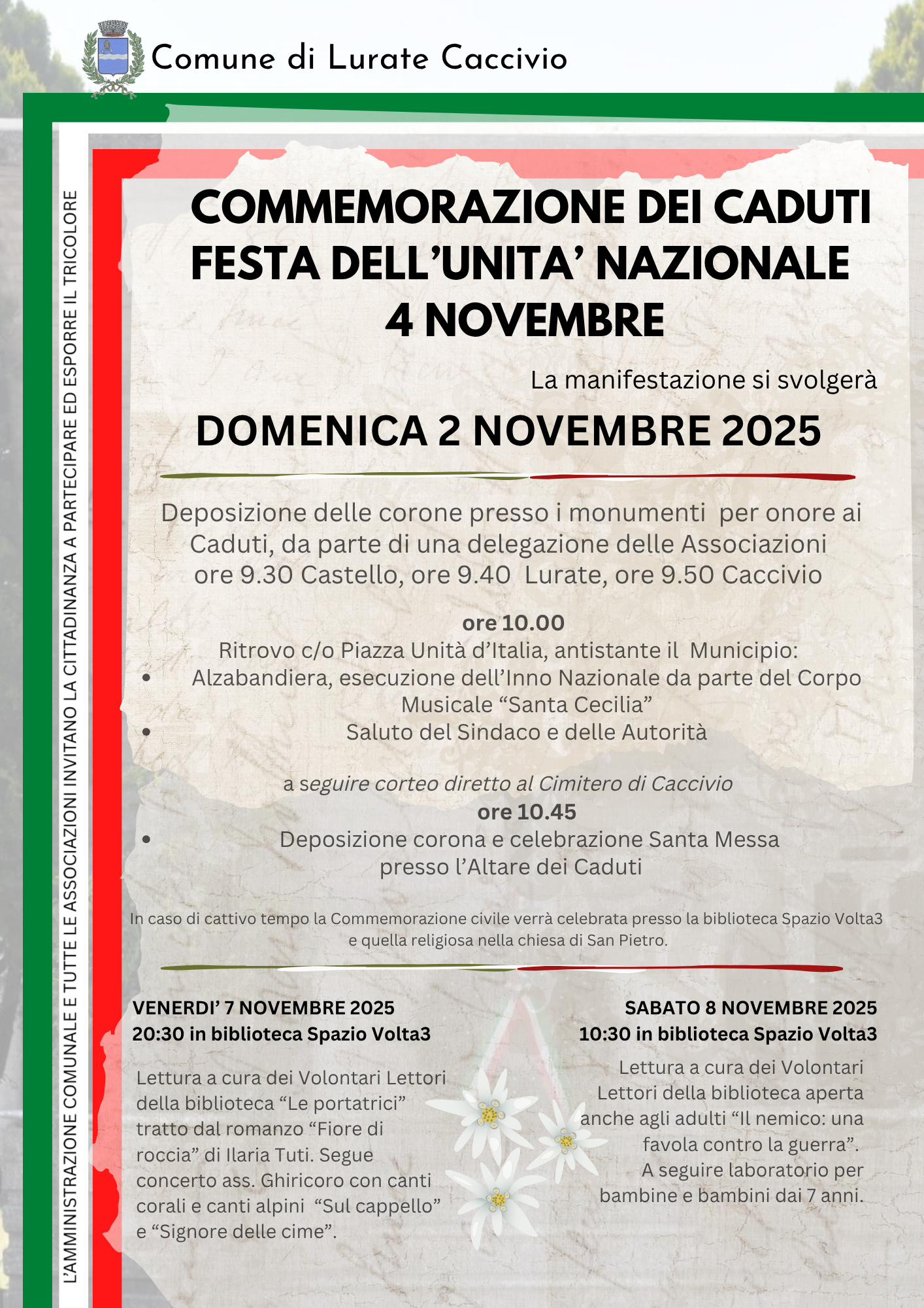 Tutti i cittadini sono invitati a partecipare alla cerimonia di domenica 2 novembre 2025 dalle ore 10 presso la Piazza Unità d'Italia antistante il Municipio che si svolgerà come da allegato programma.